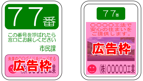 広告は番号札の両面にフルカラーで印刷します。多くの市民が利用する番号札ですから、高いPR効果が期待できます。ぜひ、ご利用ください。