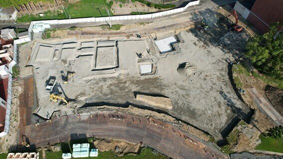 砕石を敷いて、建物の基礎を作るための準備をしています。