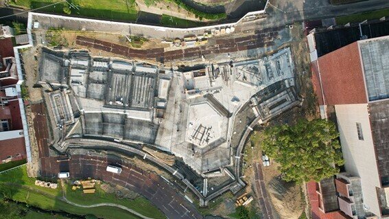 安全対策として工事現場に仮囲いを設置し、本格的な建設工事がスタートしました。