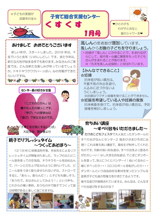 子育て支援センターでは、毎月、子育て情報や市内の子育てイベントカレンダーをなどを掲載した「おひさま子育て通信 くすくす」を発行しています。