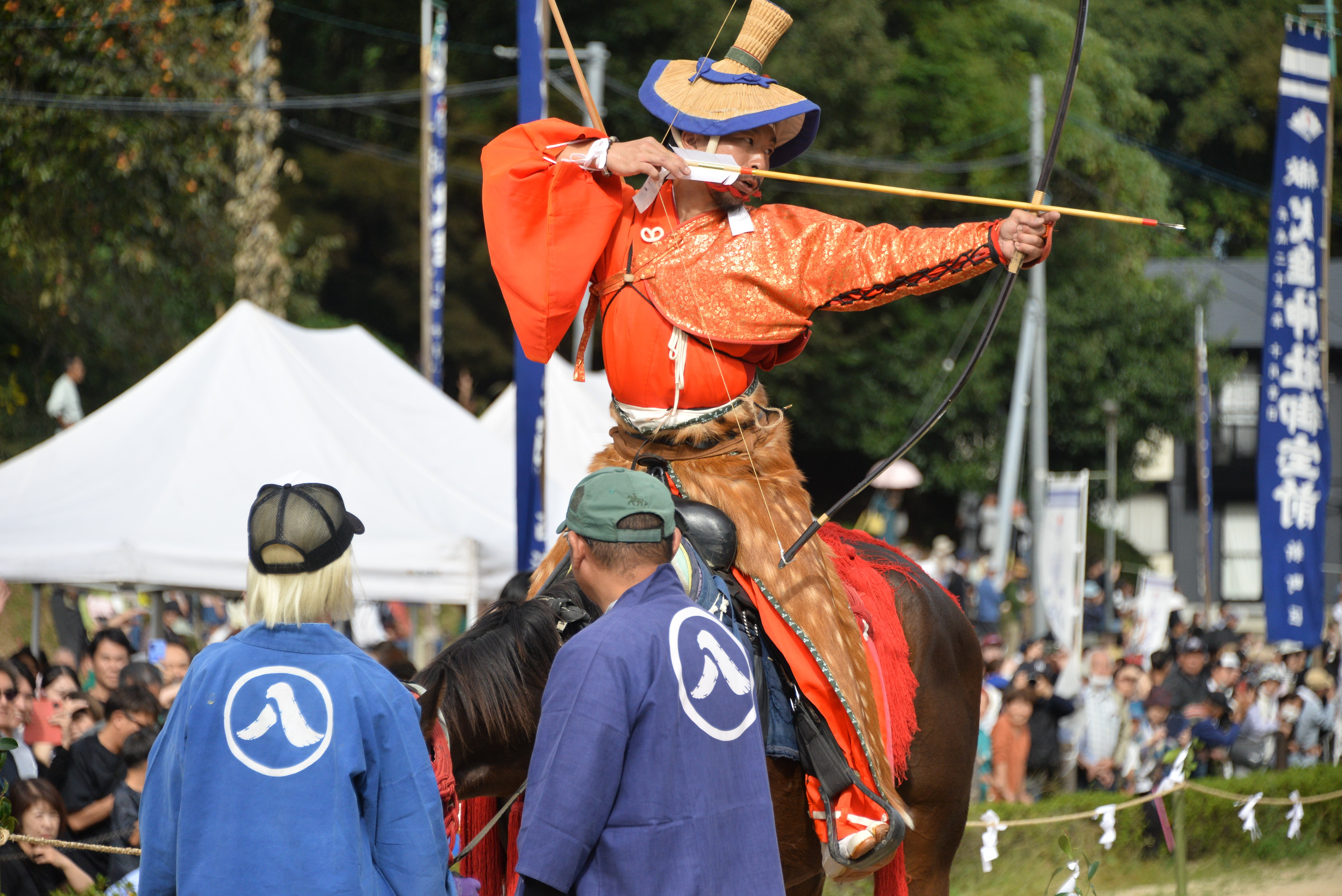 装束の射手が馬に乗って疾走しながら、馬上から3つの的を次々と射抜く、鎌倉絵巻のような勇壮な姿が特徴です。これは、文治2年(1186年)平家討伐のため源頼朝が武雄神社に戦勝祈願を行ったところ、武雄神社の使いの白鷺に励まされて戦に勝つことができたため、その礼として御教書を呈し勅使と共に使者を赴かせたところ、武雄の領主が奉納したのが始まりです。
