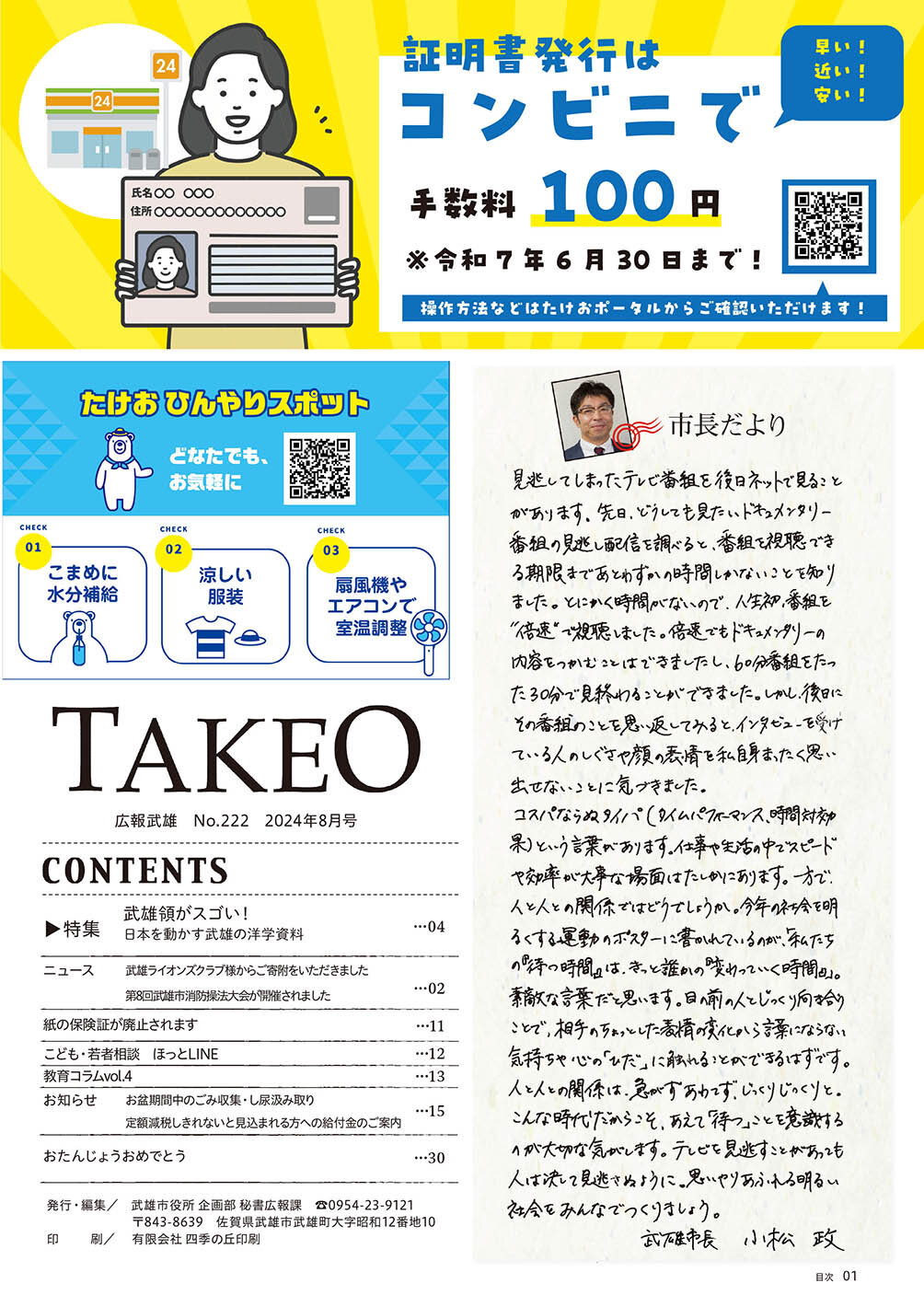 広報武雄を PDF 形式で提供しています。ご覧になりたいページ の画像又はタイトルをクリックしてください。