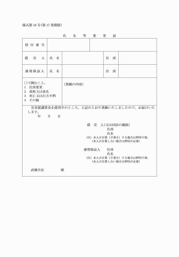 第17条 借受人又は保証人について、氏名又は住所の変更等借用書に記載した事項に異動が生じたときは、借受人は、速やかにその旨を市長に氏名等変更届(様式第16号)により届け出なければならない。ただし、借受人が死亡したときは、同居の親族又は保証人が代わってその旨を届け出るものとする。