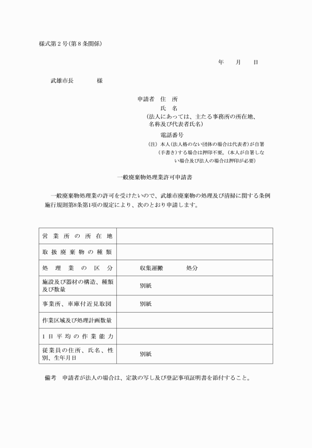 第9条 一般廃棄物収集運搬業等の許可を受けた者で、条例第20条第1項後段に規定する事業範囲の変更の許可を受けようとするものは、一般廃棄物処理業事業範囲変更許可申請書(様式第4号)を市長に提出しなければならない。ただし、当該変更が事業の一部の廃止であるときは、この限りでない。