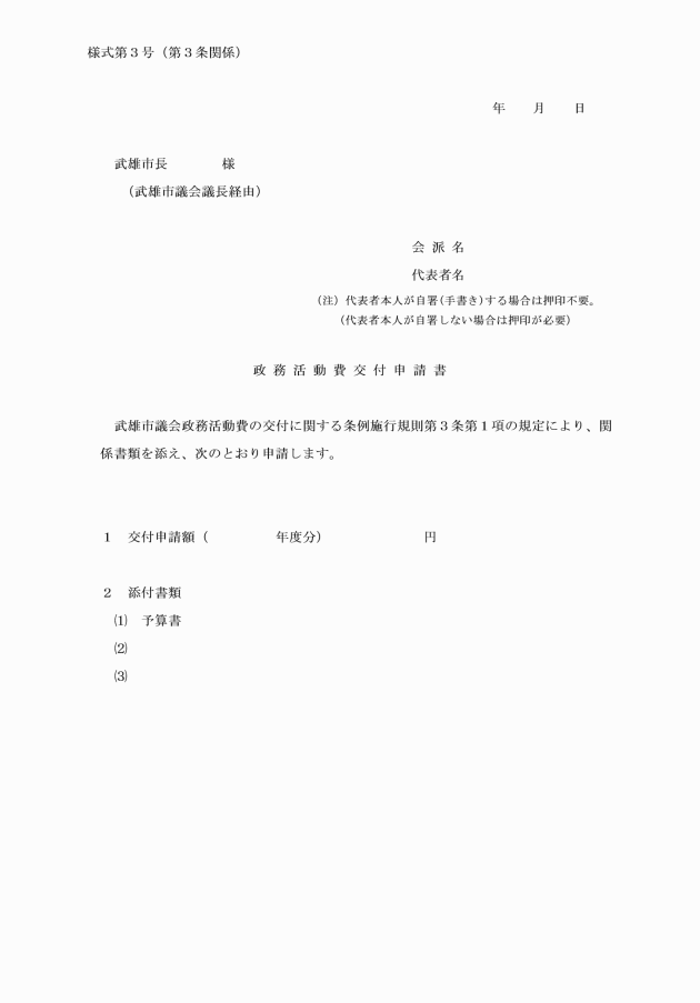 第3条 政務活動費の交付を受けようとする会派の代表者は、市長が定める日までに政務活動費交付申請書(様式第3号)を議長を経由して市長に提出しなければならない。