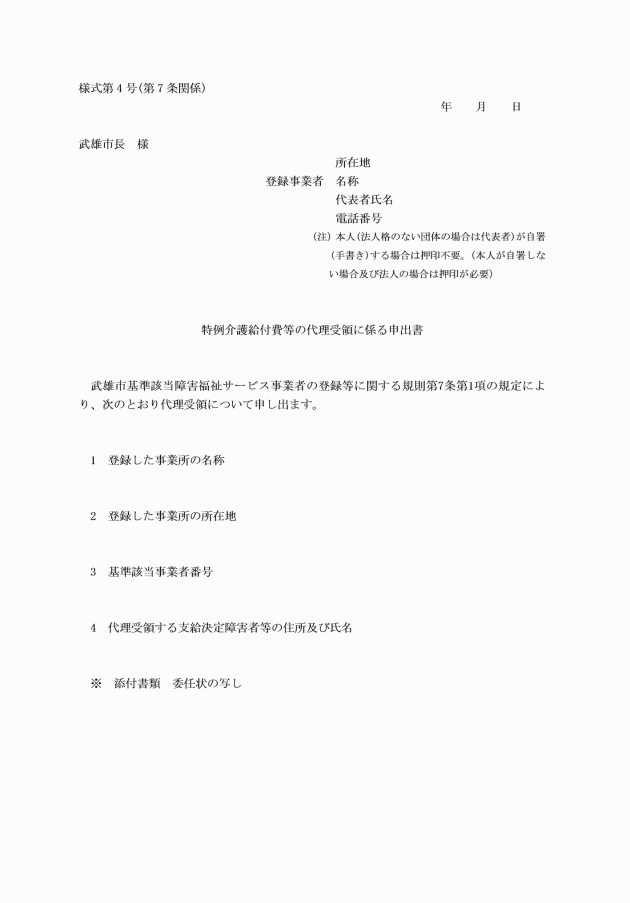 第7条 登録事業者は、支給決定障害者等からの委任に基づき、あらかじめ特例介護給付費等の代理受領に係る申出書(様式第4号)を市長に提出している場合に限り、当該支給決定障害者等が当該登録事業者から基準該当障害福祉サービスを受けたとき(当該支給決定障害者等が当該登録事業者に障害福祉サービス受給者証を提示した場合に限る。)は、当該支給決定障害者等が当該基準該当障害福祉サービスに要した費用(特定費用を除く。)について、特例介護給付費等として当該支給決定障害者等に対し支給されるべき額の限度において、当該支給決定障害者等に代わり、支払いを受けることができる。