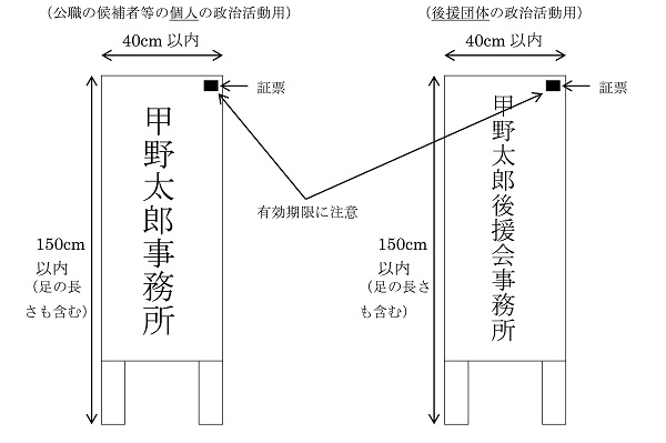 立札及び看板の類には、前面の見えやすいところに、1枚ごとに、選挙管理委員会が交付する「証票」を貼付しないと掲示できません。